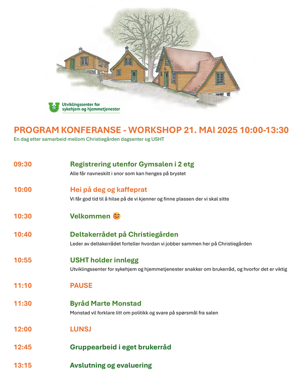 Deltakerrådet på Christiegården dagsenter inviterte alle deltaker-/brukerrådene i kommunen til konferanse. Til stede var også USHT (Utviklingssenter for sykehjem og hjemmetjeneste), Byråd Marte Monstad, og selvsagt Veivalg.